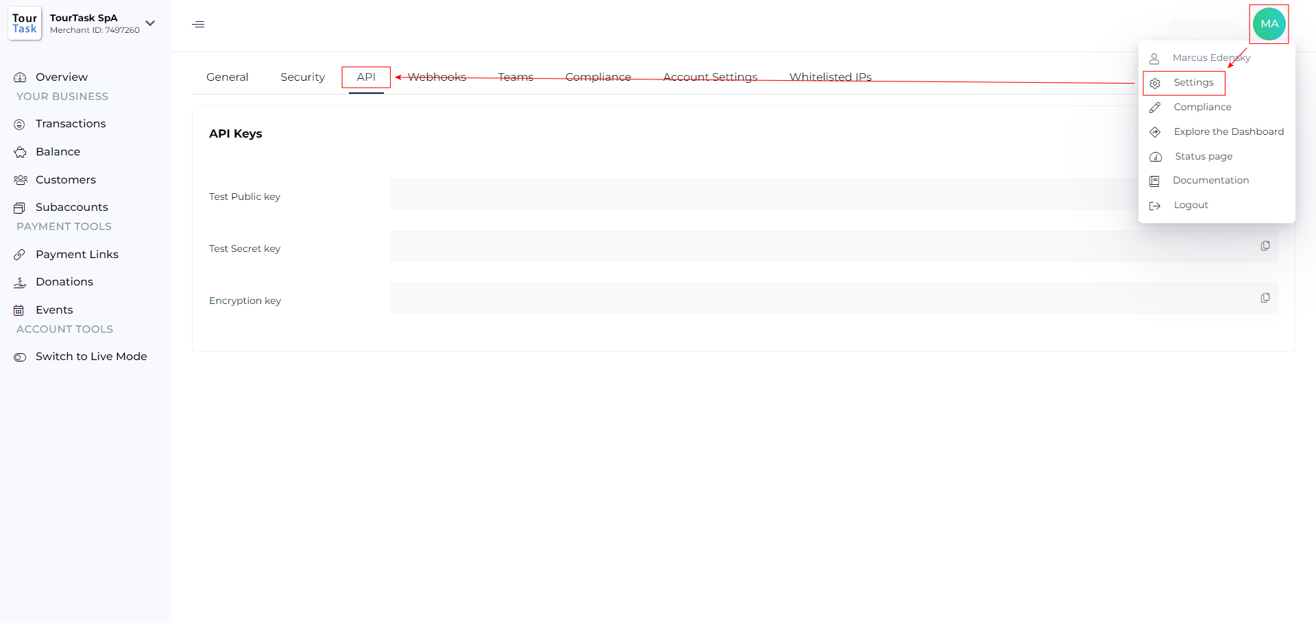 These credentials must be entered in TourTask to activate this payment gateway. To achieve this, follow these steps: